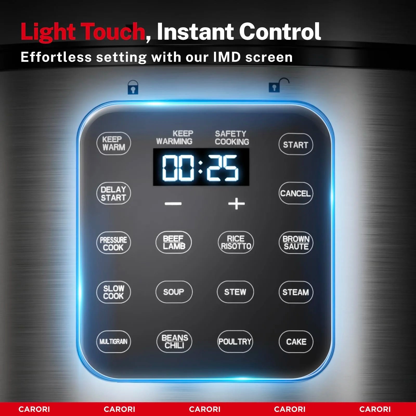 IMD Touchscreen: Featuring a high-definition IMD touchscreen delivers a stunning touch experience, this pressure cooker offers easy, fingertip control. No more struggling with hard-to-press buttons—just a light touch to select from 12 versatile cooking programs for perfect meats, vegetables, beans, rice, poultry, cakes, and more.