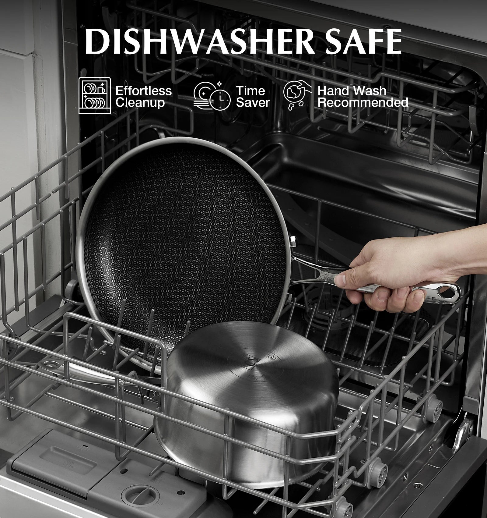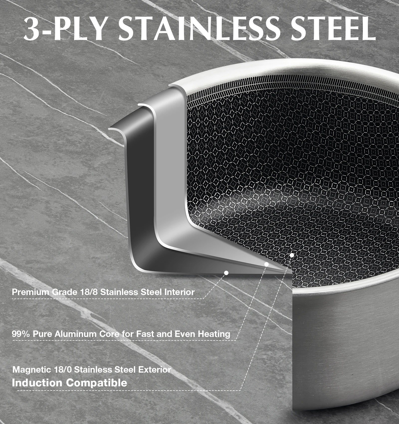 Hybrid Honeycomb Interior: The innovative hybrid honeycomb design of stainless steel saucepan provides exceptional non-stick performance, allowing for easy cooking. Built for durability, it resists peeling and is safe for use with metal utensils, ensuring long-lasting reliability without compromising food quality.